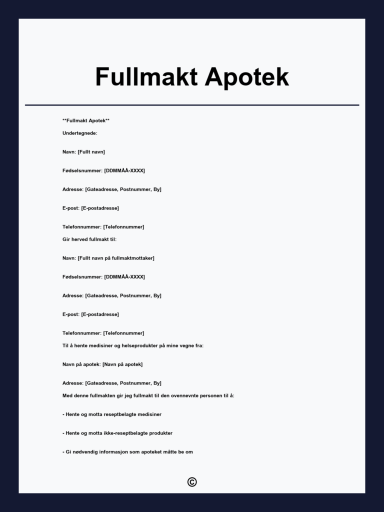 Last ned fullmakt til å hente medisiner gratis og enkelt. Praktisk dokument for deg som trenger at noen henter medisiner på dine vegne uten problemer.