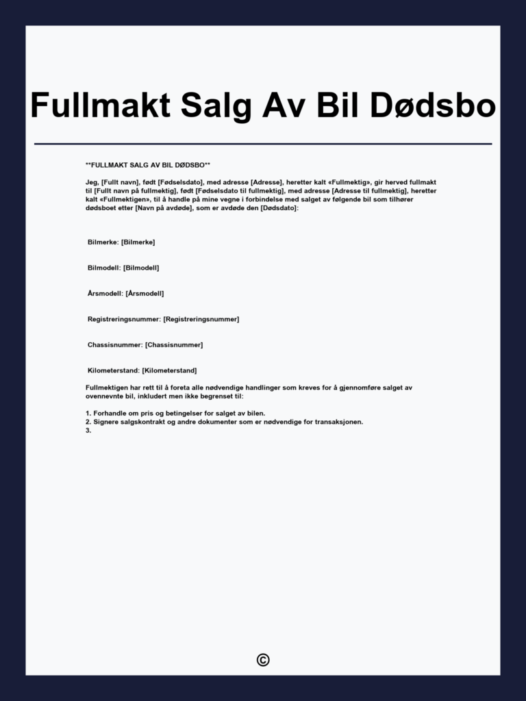 Last ned gratis fullmakt for salg av bil, enkel digital utfylling og signering med Bank-ID gjennom Postens sikre e-signeringstjeneste. Effektivt og trygt for begge parter.