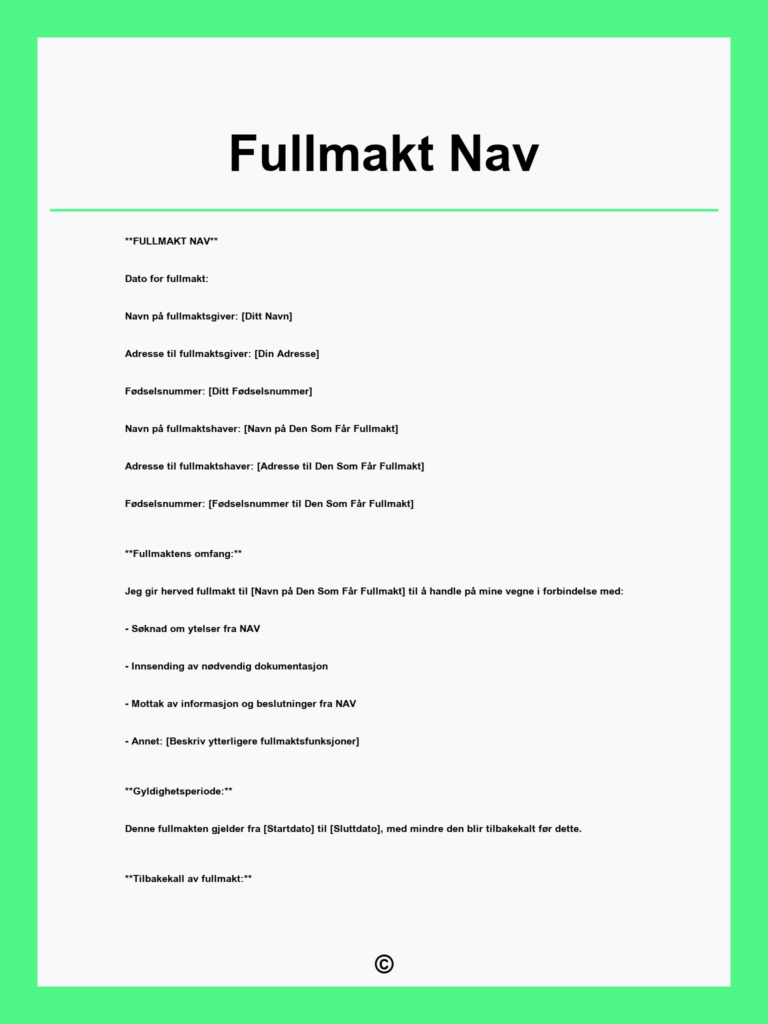 Last ned gratis fullmakt for NAV for å gi behandler tilgang til din søknad. Enkel utfylling etter kartlegging, sikrer rask og korrekt behandling av dokumenter.