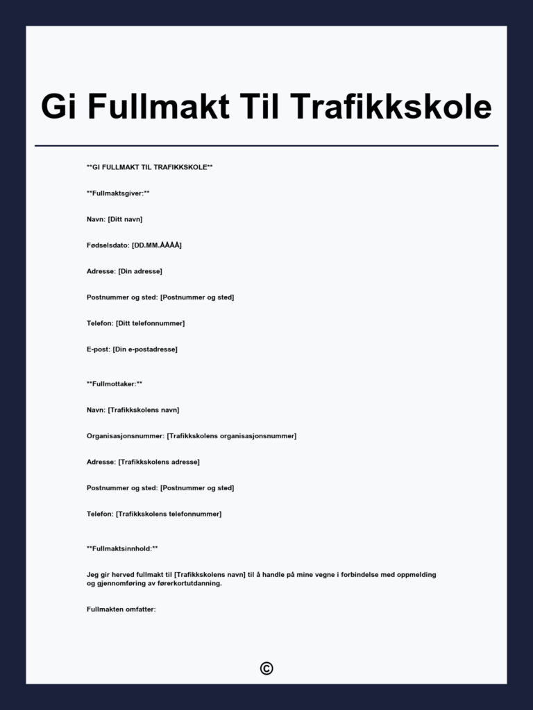 Last ned fullmakt til trafikkskole gratis i PDF