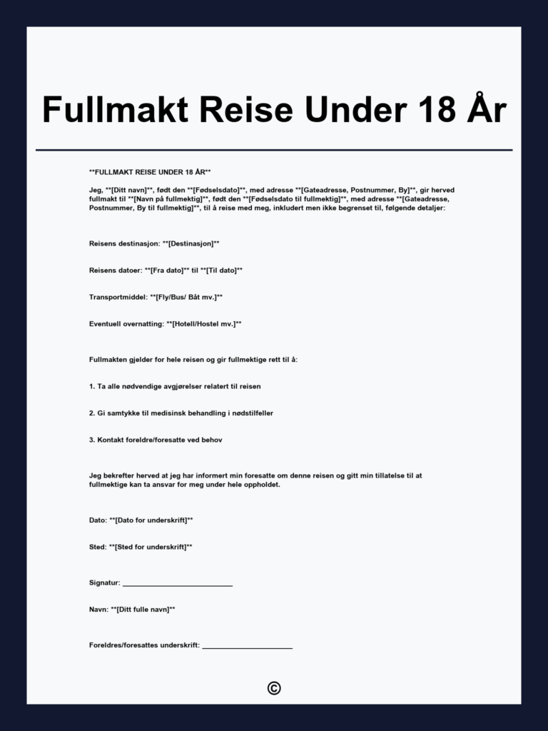Last ned gratis fullmakt for personer under 18 år, som bekrefter foreldres eller verges ansvar for mindreårige gjesters handlinger og kontaktinformasjon. Enkel og klar mal tilgjengelig.