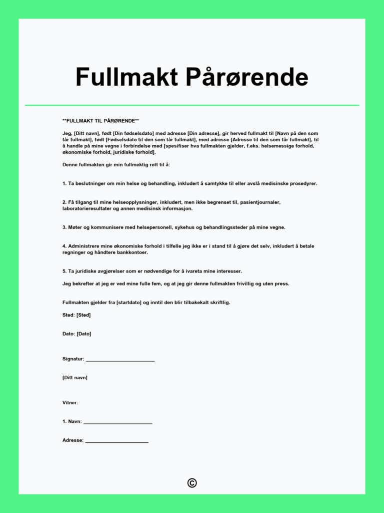 Last ned gratis fullmakt for pårørende, en enkel og juridisk gyldig mal som gir fullmektig rett til å handle på vegne av en annen person.